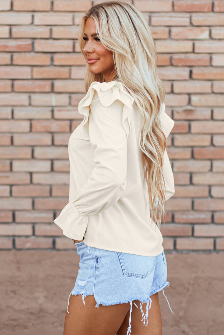 Beige Ruffled Flounce Sleeve Corduroy Blouse