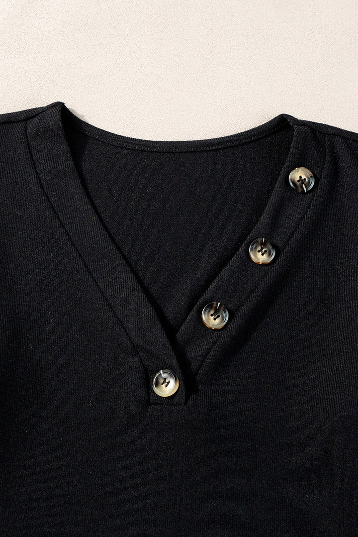 Black Buttoned V Neck Ribbed Puff Sleeve Top