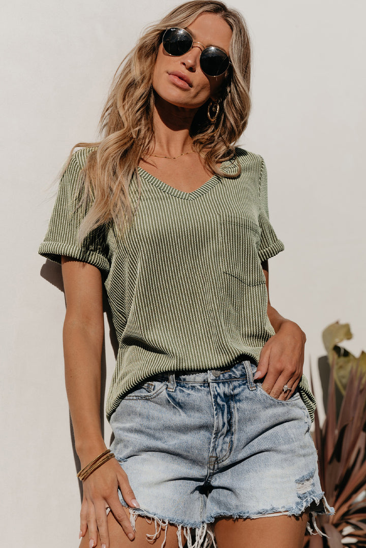 Laurel Green Twist Short Sleeve Corded V Neck Top
