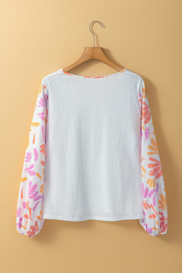 White Tropical Leaf Printed Patchwork Sleeve Round Neck Top
